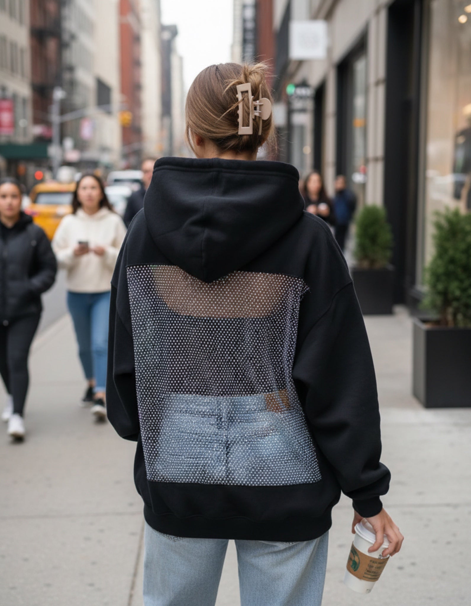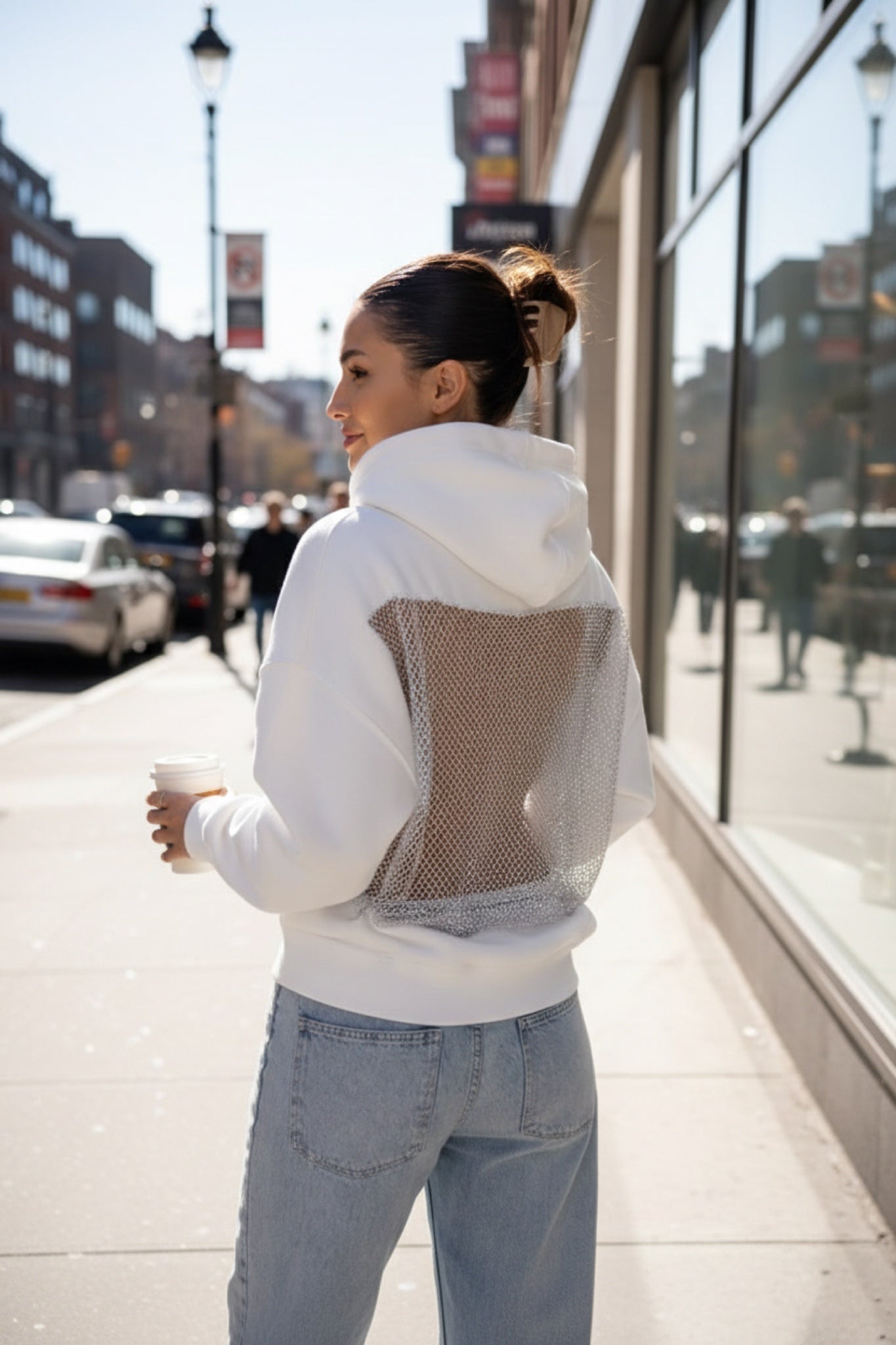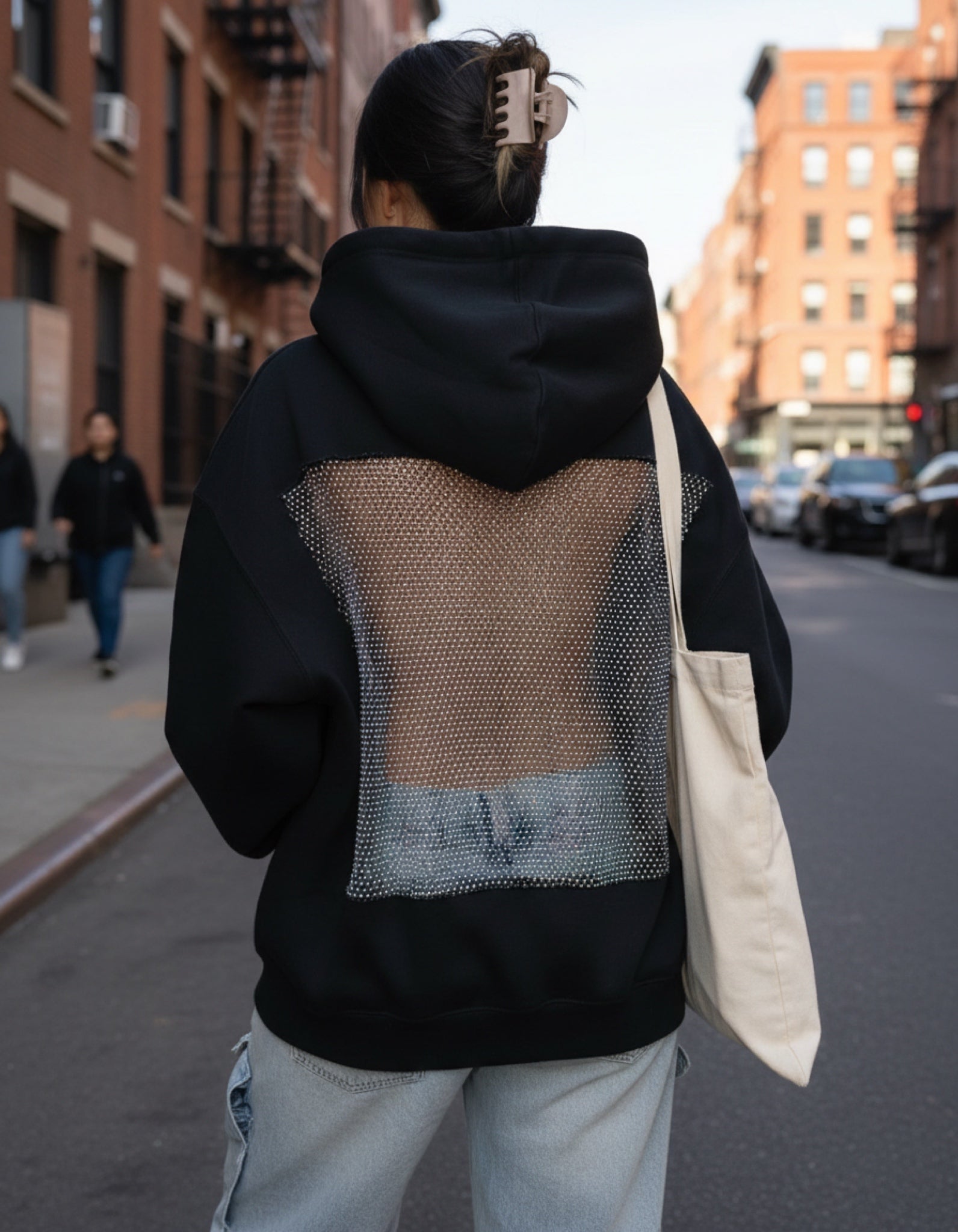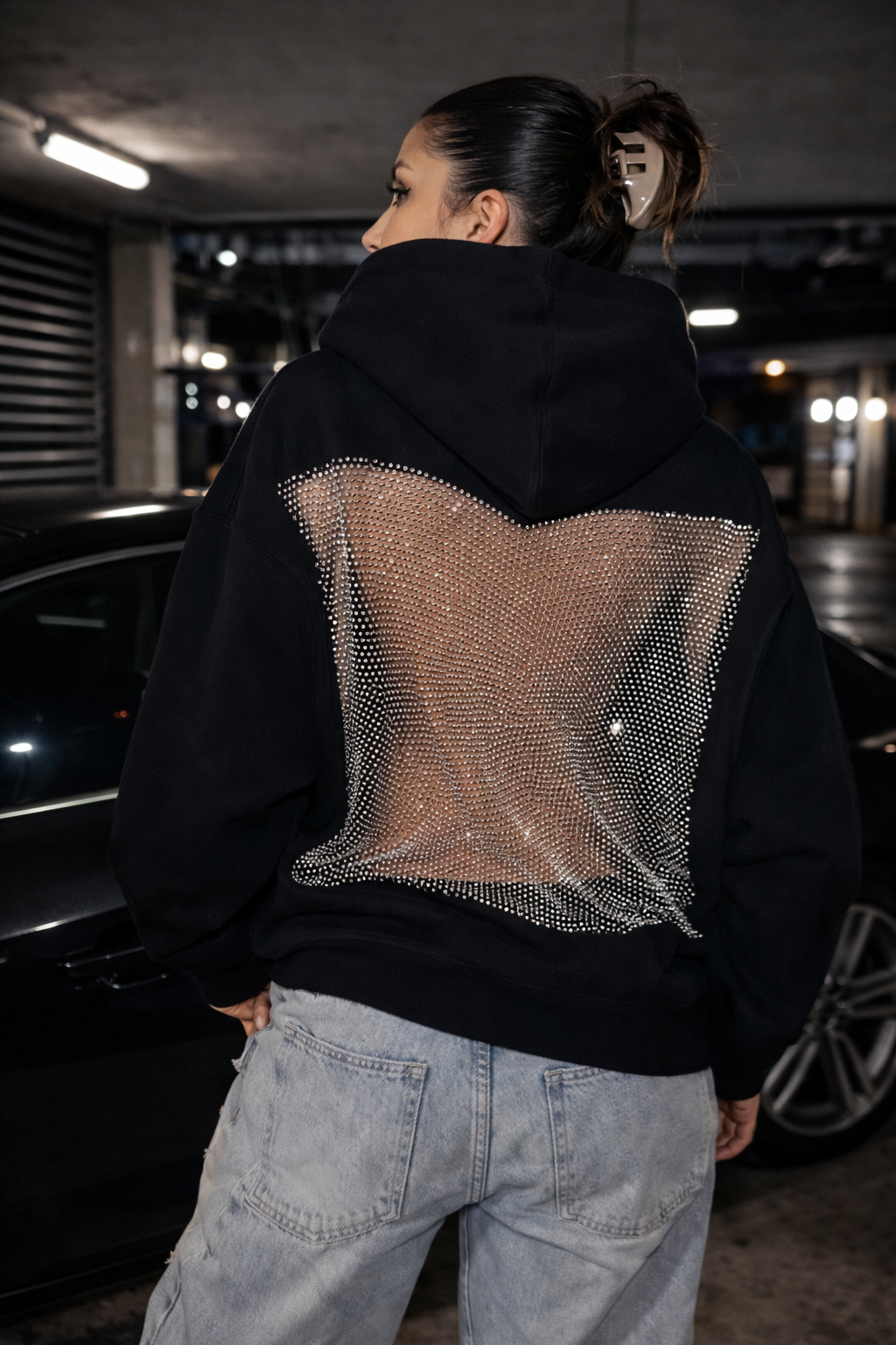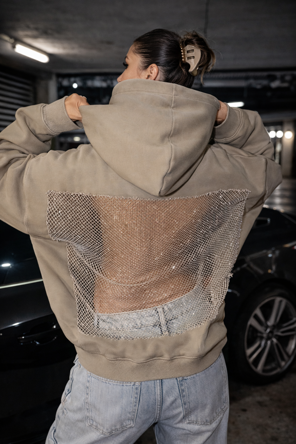 Drąsus ir išskirtinis oversized džemperis su gobtuvu, sukurtas moderniam miesto stiliui. Priekyje – minimalistinis, lygus dizainas, o nugaroje – atvira, permatoma tinklelio detalė, suteikianti seksualumo ir išskirtinumo. Puikiai tinka streetwear, vakarėlių ar kasdieniams drąsesniems deriniams.