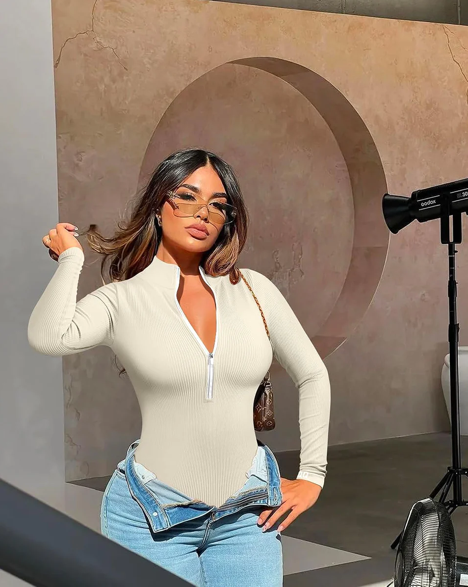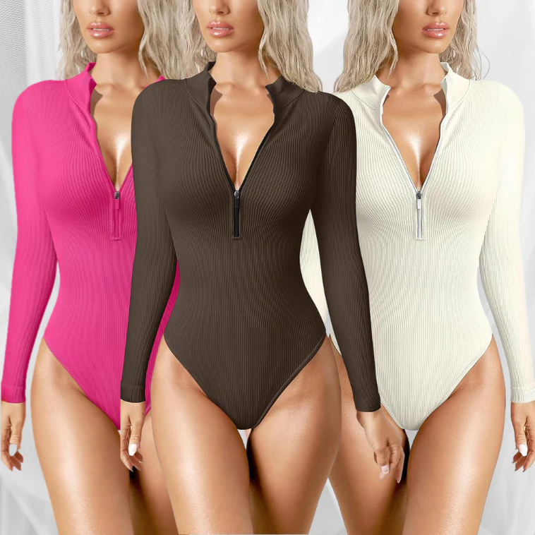 Savim pasitikinčiai ir madingai moteriai sukurtas kostiumėlis puikiai derina madą ir funkcionalumą. Gili iškirptė su užtrauktuku suteikia šiam būtinam drabužiui seksuolumo. Tai daugiau nei tik bodis - tai jūsų drabužis vakarui su draugais, išvykai į miestą ar net kasdieniam dėvėjimui namuose. Besiūlis briaunoto trikotažo dizainas ne tik puošia jūsų apvalumus, bet ir suteikia išskirtinio lankstumo, todėl galėsite laisvai judėti visą dieną.
